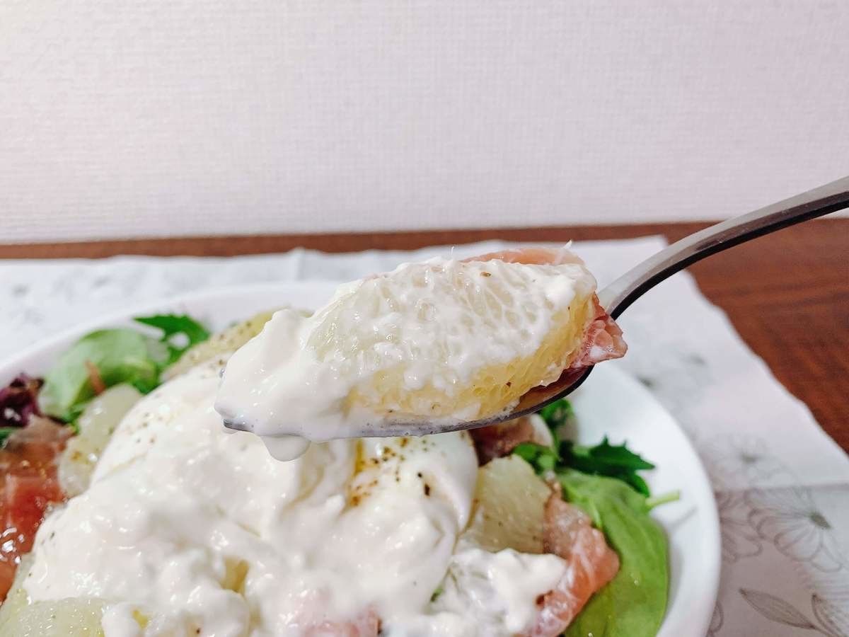 クリームの甘さと生ハムのしょっぱさ、そこにグレープフルーツの酸味が加わってバランスがいい!