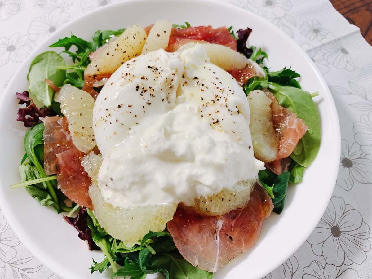 番組で紹介されていた「グレープフルーツとブッラータのサラダ」を作ってみました。
