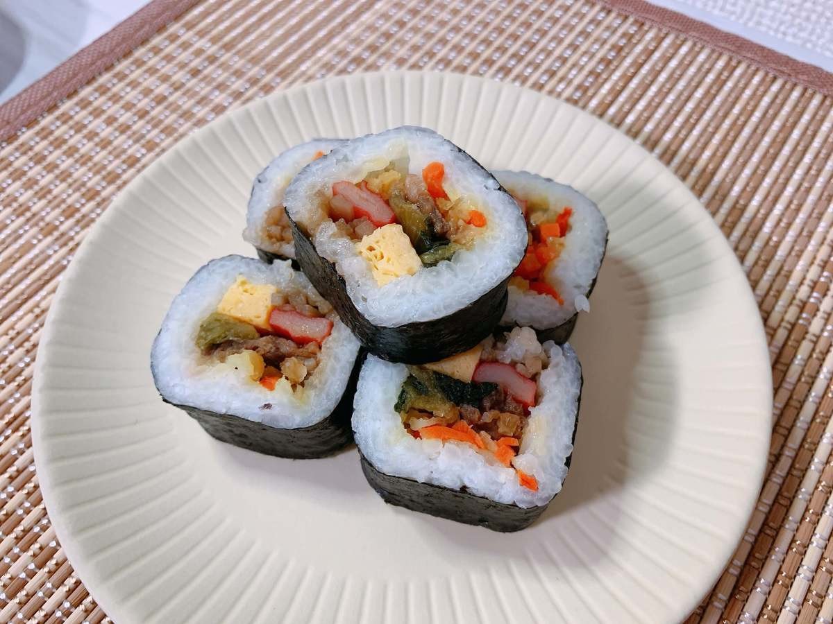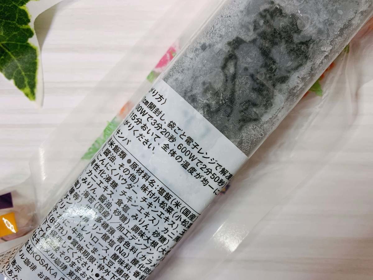 カルディの冷凍キンパは、国産米を使用しており、具材は牛肉・小松菜・玉子焼・カニ風味かまぼこ・にんじん・味付けごぼう・調味大根と計7種類も入っています。