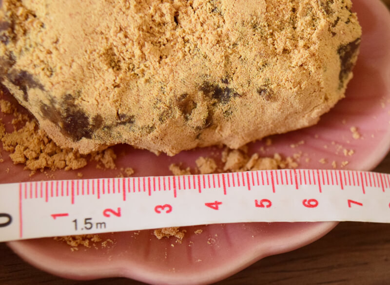 溢れ出すきなこをよけながら、なんとかおはぎの長さを計測したところ、どうやら6~7cmある模様。
