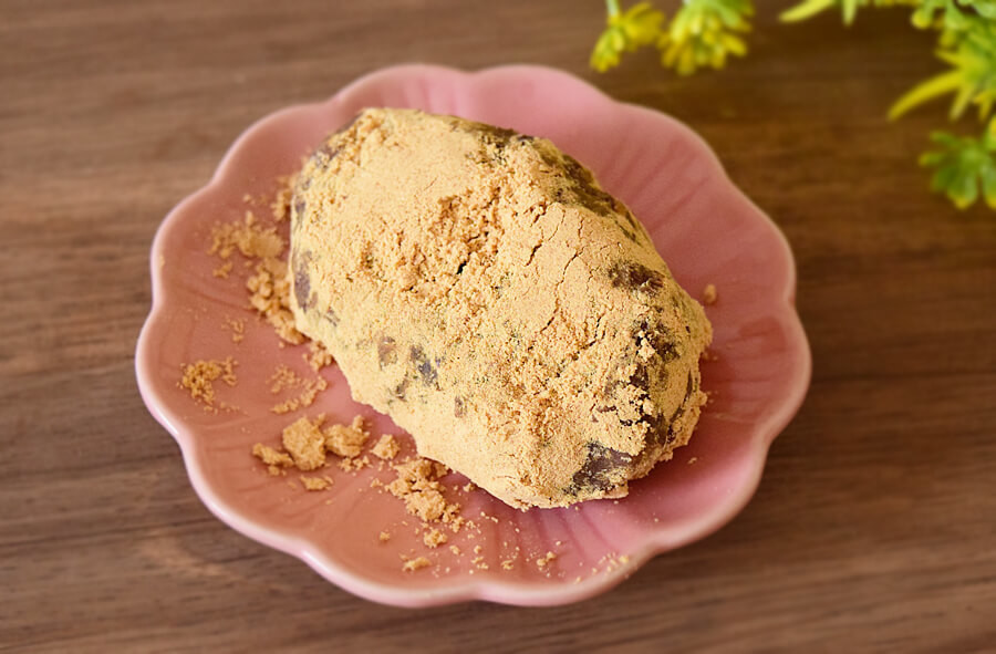 粒あん全体を覆うようにきなこがたっぷりかかっています。食べる前から、きなこの心地よい香りがふわっと通り抜けていきます。