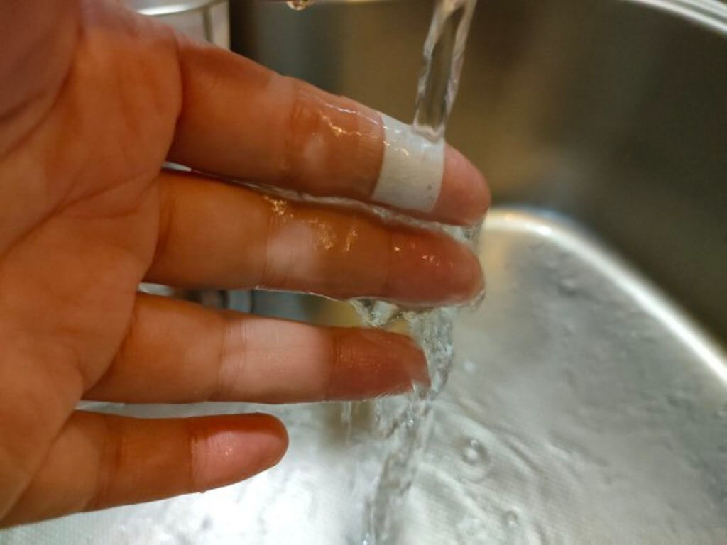じゃぶじゃぶ水を当てても、防水なので傷口にしみることもなく快適に作業できます。筆者の子どもたちもちょっとした傷を作ってきた時などに使っています。目立ちにくいため使うのを嫌がることもなく、手洗いもしっかりやってくれて助かっています。