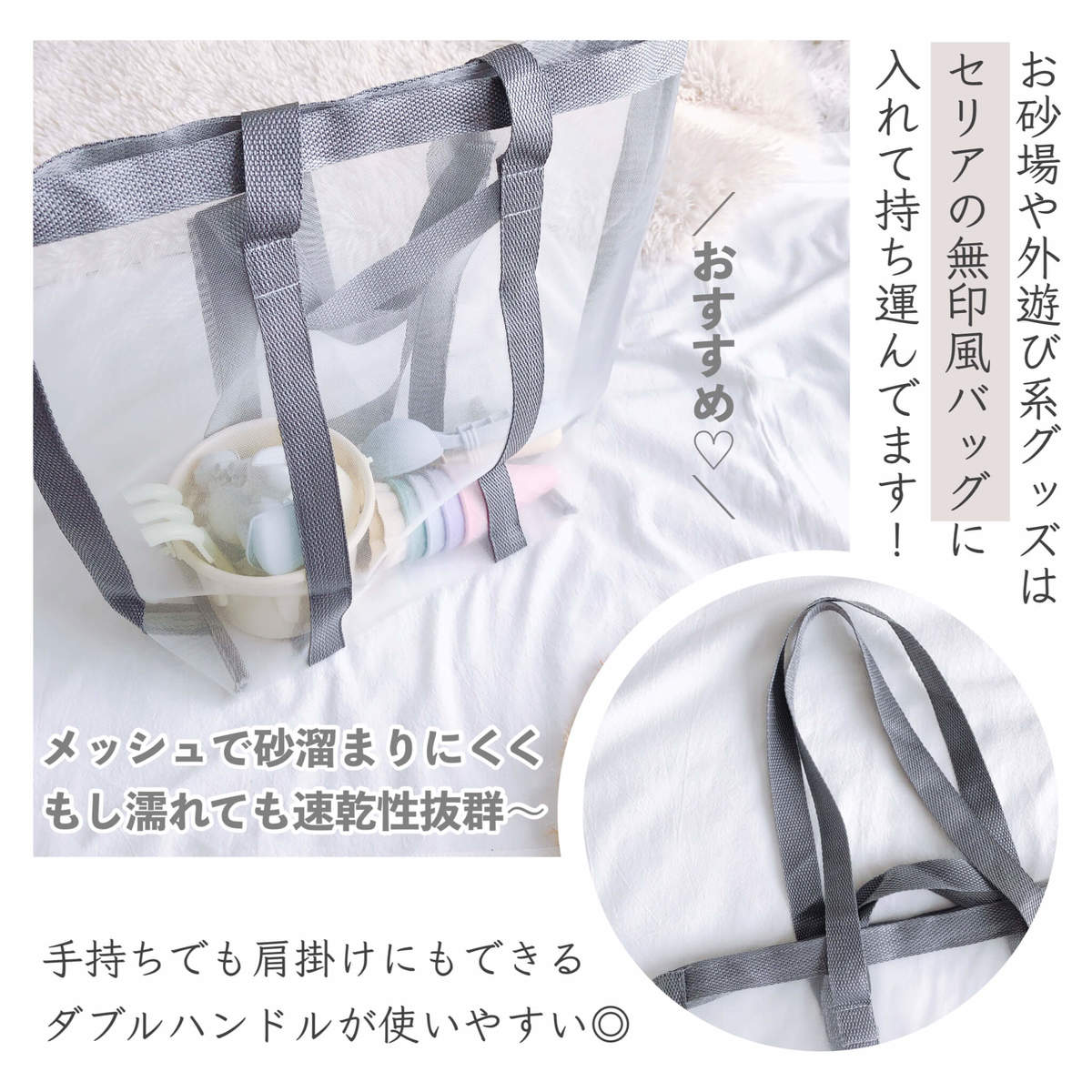 お砂場や外遊び系のグッズは、セリアの無印風バッグ(ランドリーバッグ)に入れて持ち運んでいます。メッシュで砂溜まりにくく、もし濡れても速乾性抜群!