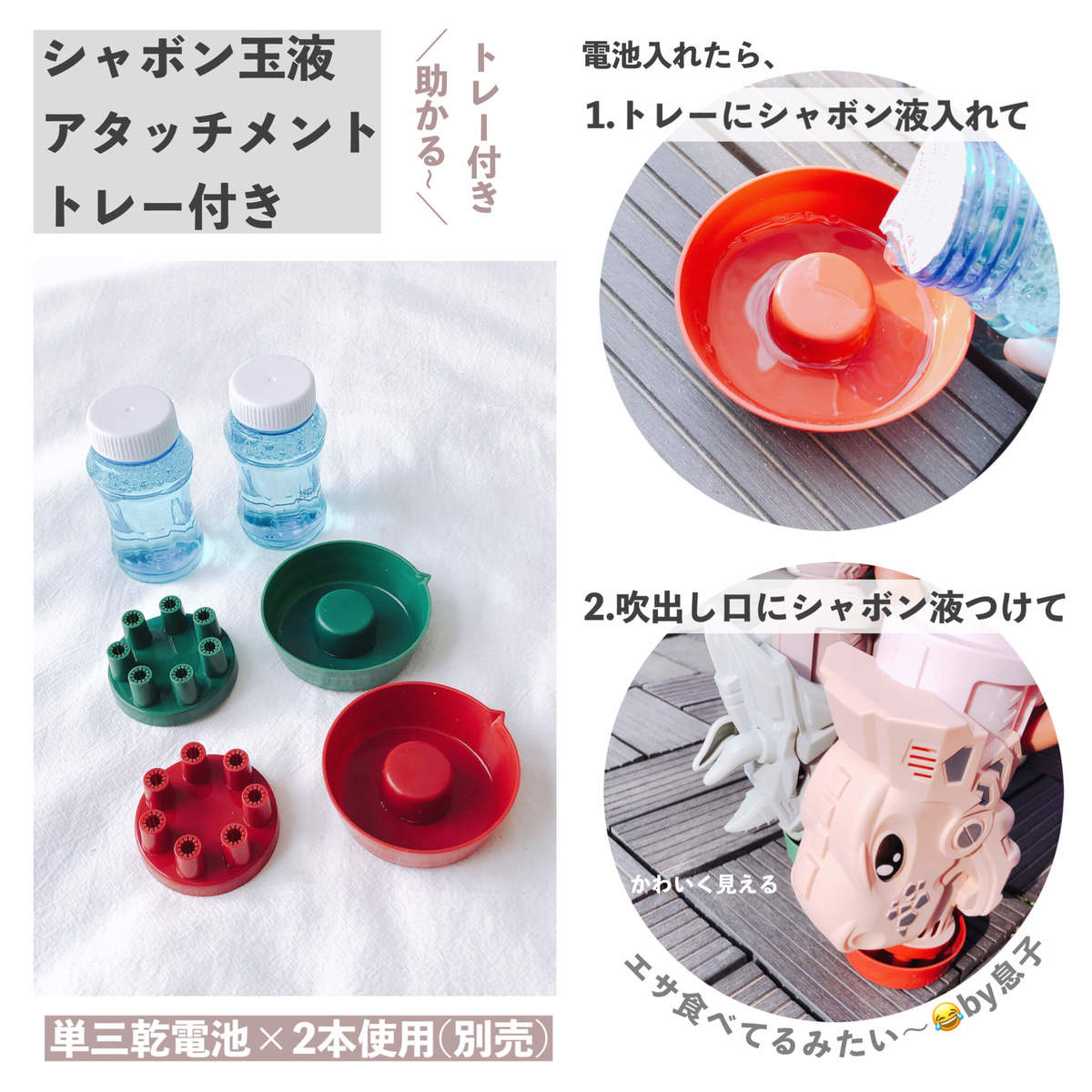 恐竜のシャボン玉は軽い力でボタンが押せるので、子どもも使いやすく液だれしないのも良かったです。