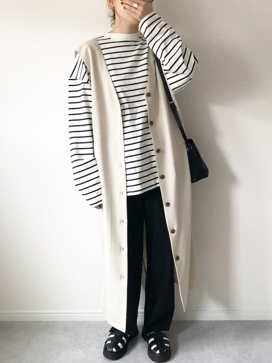 ブラック×ボーダーのカットソー×ベージュのロングジレ