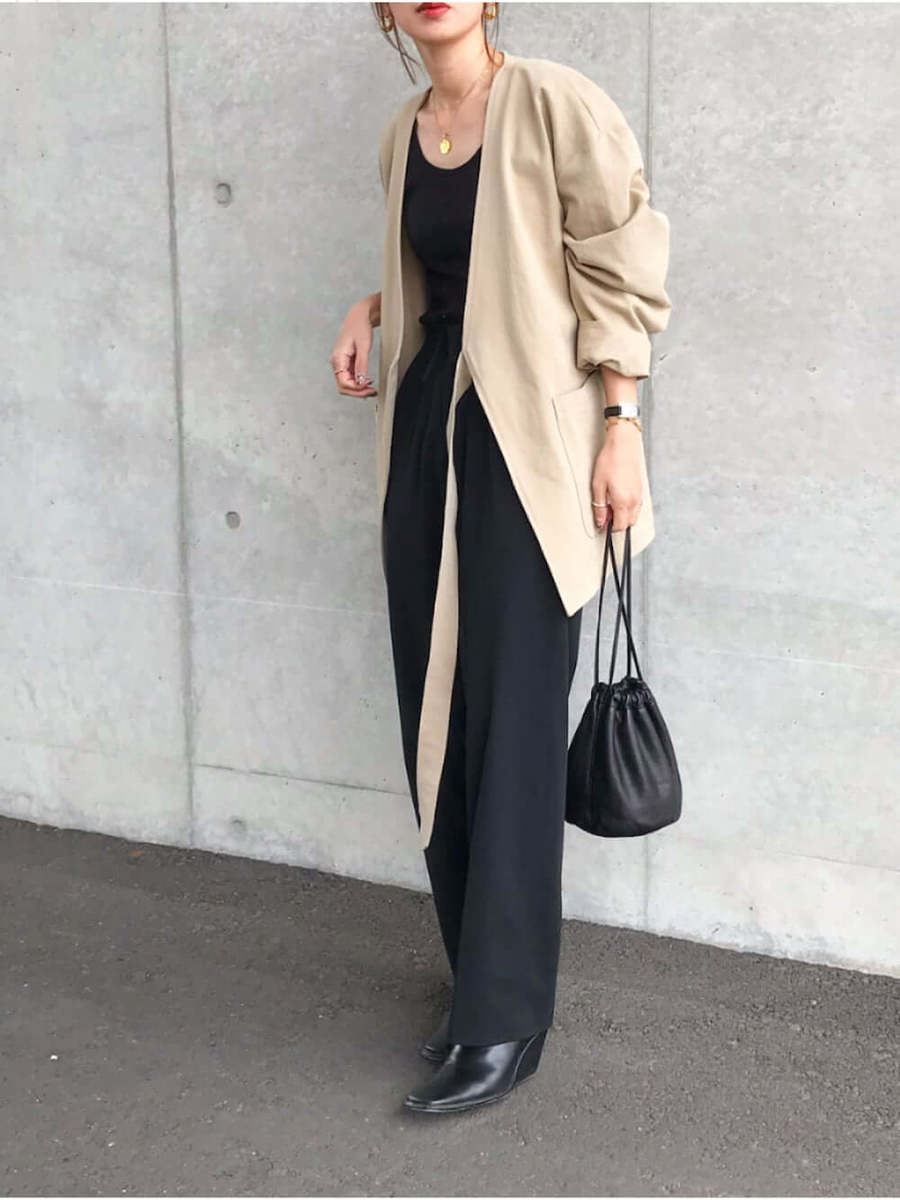 ブラックのパンツは同じく黒のタンクでワントーンに。ラフなベージュのジャケットを羽織れば、キレがあるのにやわかなムードが加わります。