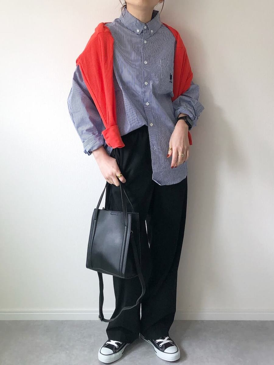 ブラック×ブルーのオックスフォードシャツ×オレンジのカーデ