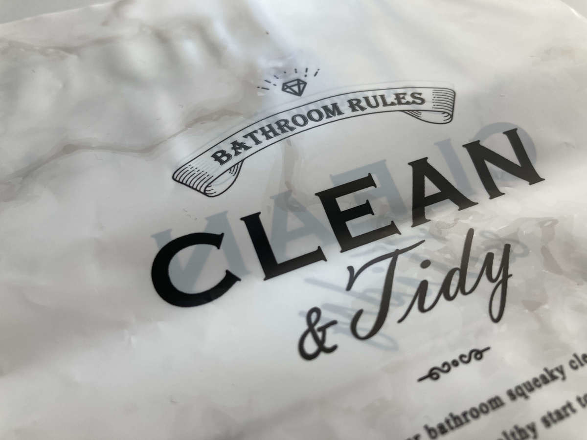 大理石柄だけでもおしゃれなのに、英字のロゴまで入っていますよ。ますますゴミ袋に見えず、ちょっと髪の毛などゴミを入れるのは気が引けるような(笑)。