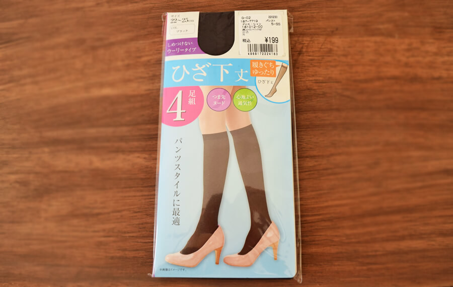 ひざ下丈のハイソックス(ストッキングのような素材)が4足組で199円(税込)。