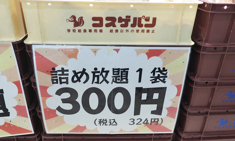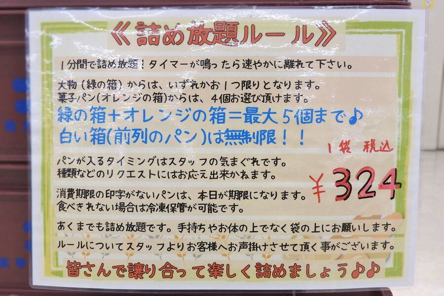 また、大物(緑の箱)からは1個、菓子パン(オレンジの箱)は4個と制限がありますが、その他は詰め放題です。詰め放題のルールは、詰め放題直前に店員さんから説明がありますよ。