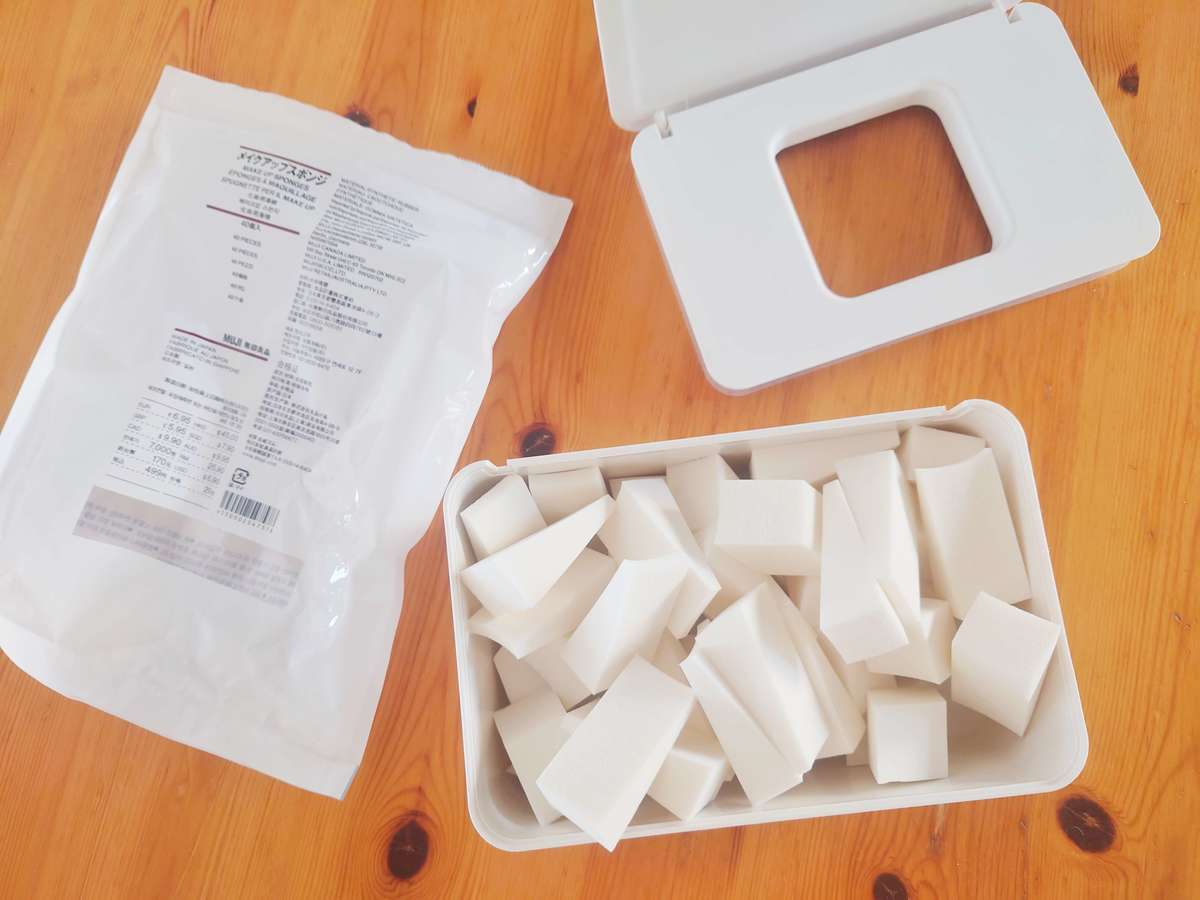 小物の収納にも使えそうなので、無印良品の「メイクアップスポンジ 40個入り(499円税込)」を入れてみました。