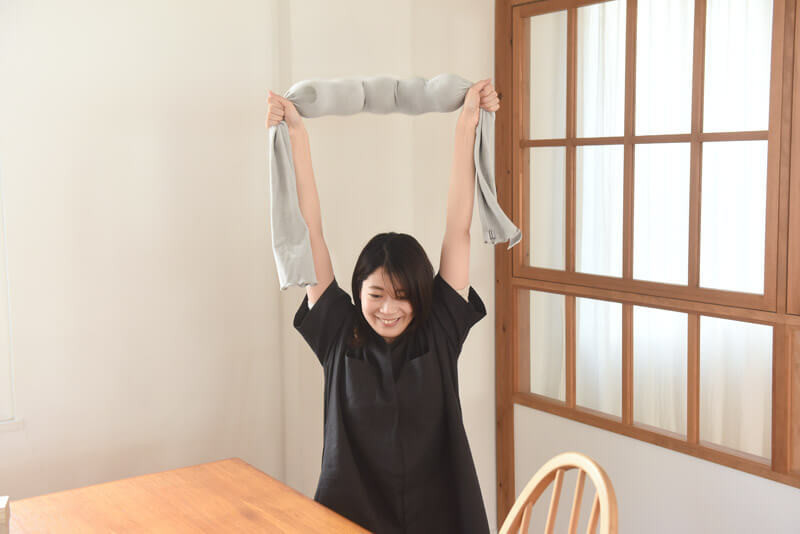 胸の前で行えば肩や背中のエクササイズに、足で挟めば太ももにと、使う位置によって異なる部位に働きかけられます。