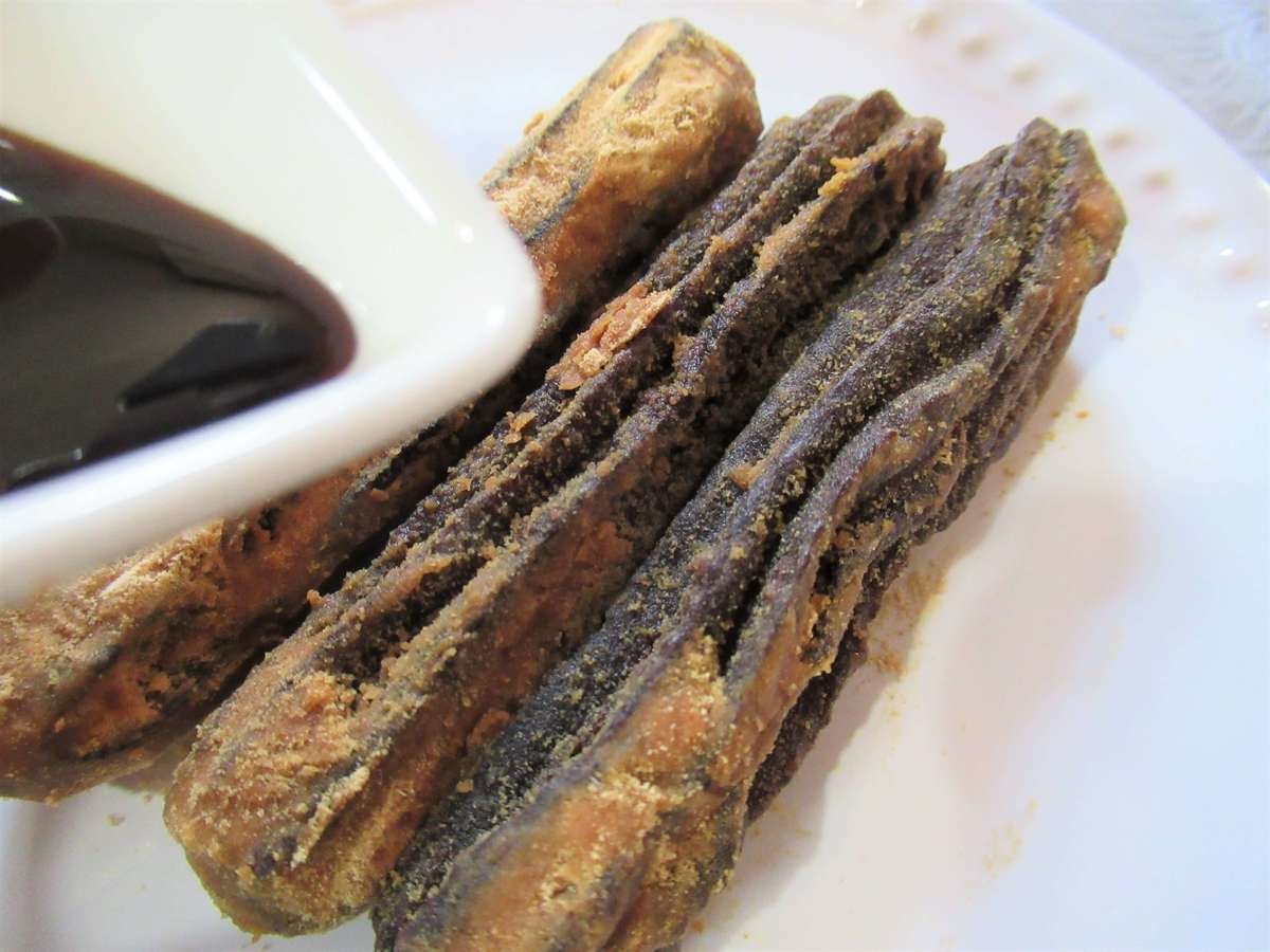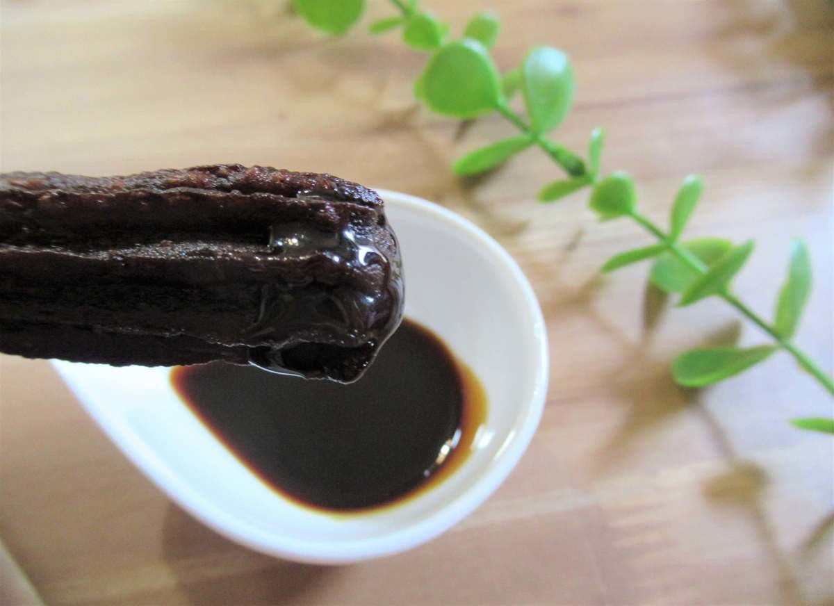きな粉をまぶしたチョコチューロスにグレープモラセスをかけて食べてみると、これまた絶品!