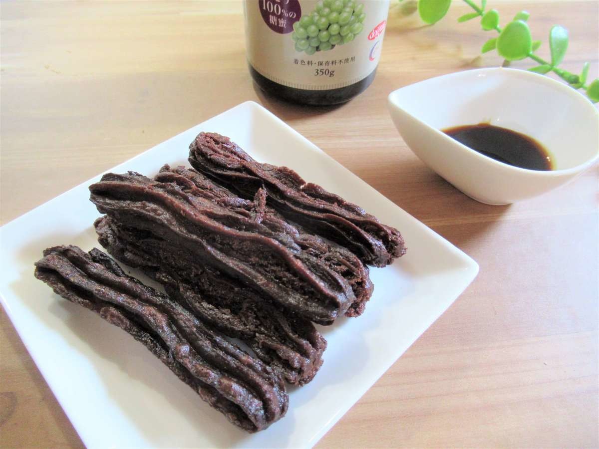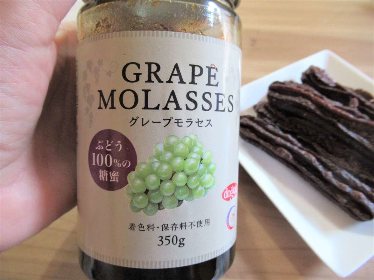 今回は、わが家に常備している業務スーパーの「グレープモラセス」をチョイスしてみました。 ちなみに「グレープモラセス」は、ぶどう100%の糖蜜で、フルーティな黒蜜という印象の甘味料です。
