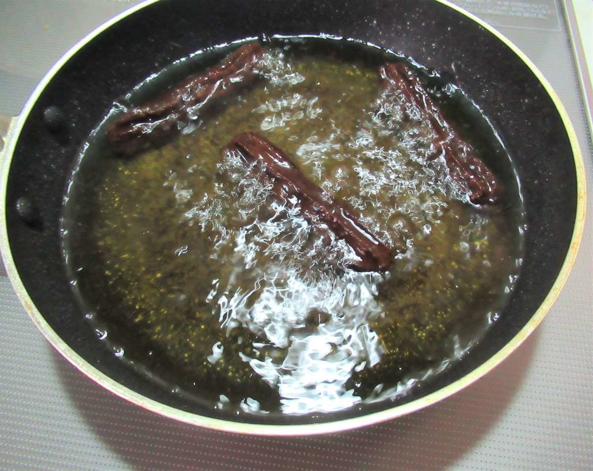 180℃の油で凍ったまま3本あたり3分~3分30秒揚げる