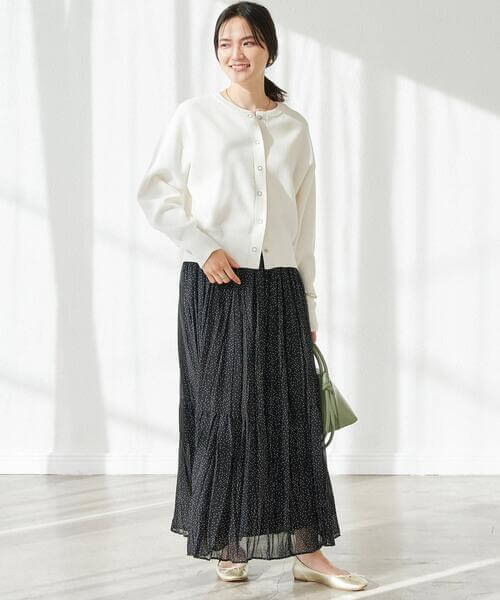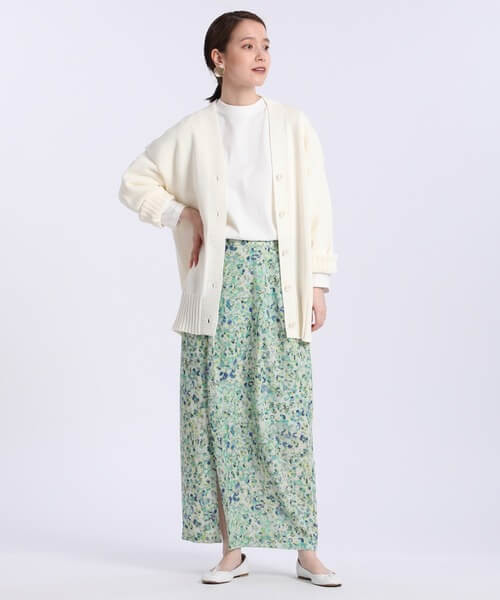 オーバーサイズの白カーデにロング丈のフレアスカートやマーメイドスカートの組み合わせは着膨れが心配ですが、引き締めカラーにすればシャープさが加わります。