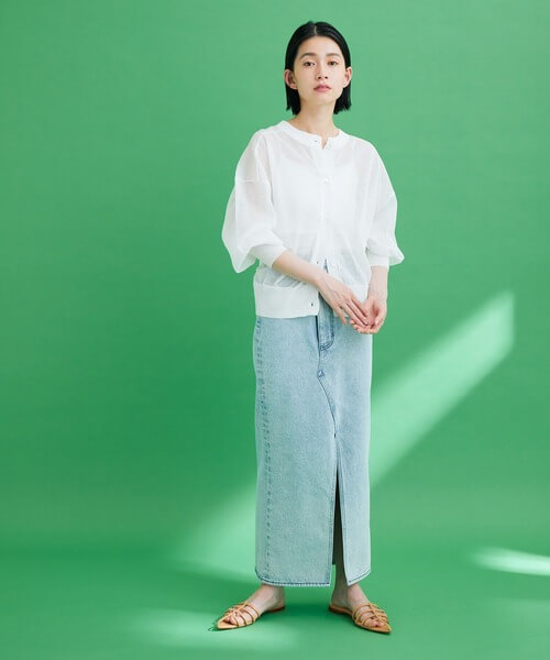 程よく体型カバーをしてくれるゆったりシルエットも、シアー素材なら着膨れしづらく着こなしやすいです。