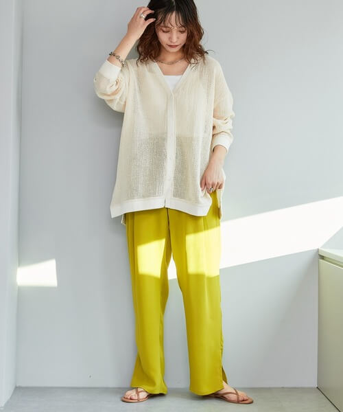 オーバーサイズのカーディガンのときは、羽織りとして着こなします。インナーに胸元の開いたタンクトップやキャミソールを仕込んで、適度な肌見せをするとスッキリまとまります。
