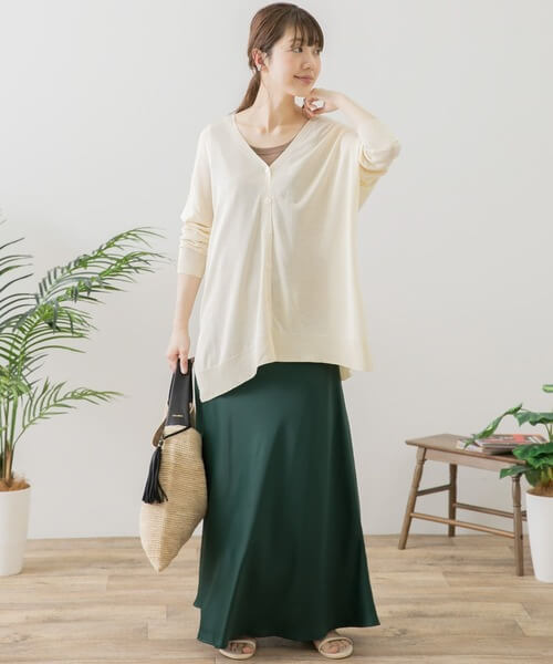 ボックスシルエットの白カーディガン×グリーンロングスカート
