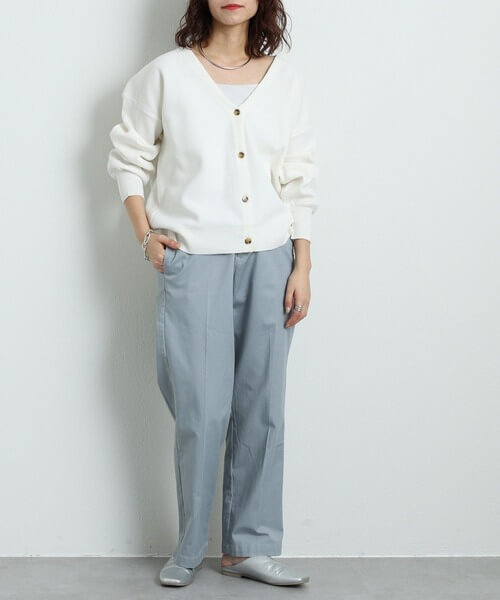 クロップド丈のカーディガンも、羽織りにすると縦ラインを強調できて、スッキリ見えします。