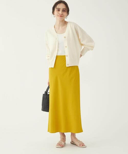 イエロー系のカラースカートを合わせてメリハリを付けて。