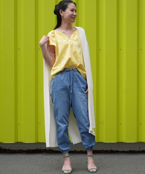 カラーパンツを合わせることで、トレンドライクなコーデに。