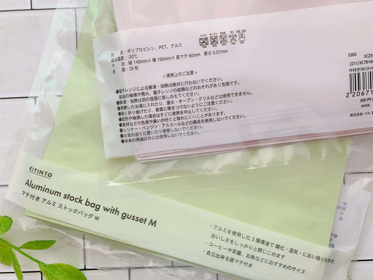 そんな3COINSでも特に人気の高いキッチングッズから、今日はカラフルでかわいい『マチ付きアルミストックバッグ』を紹介したいと思います。
