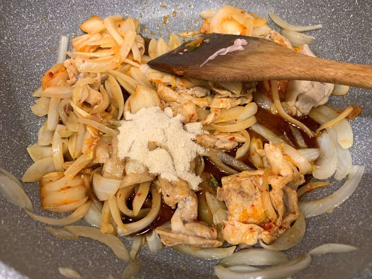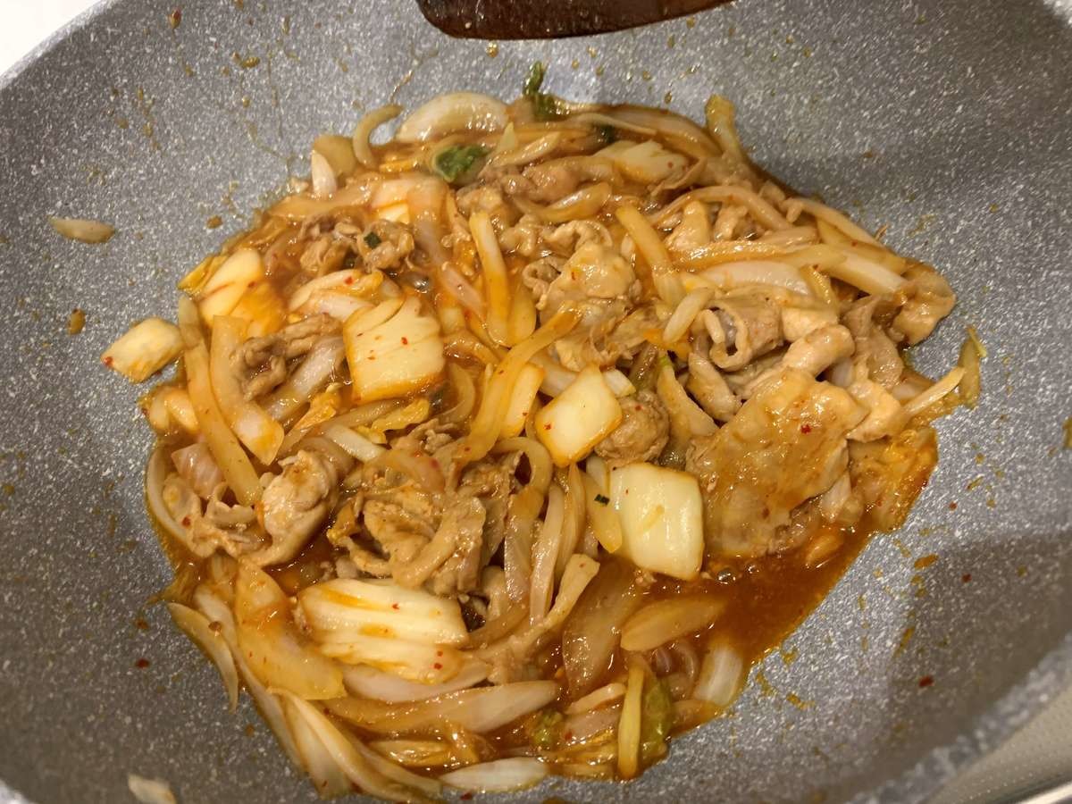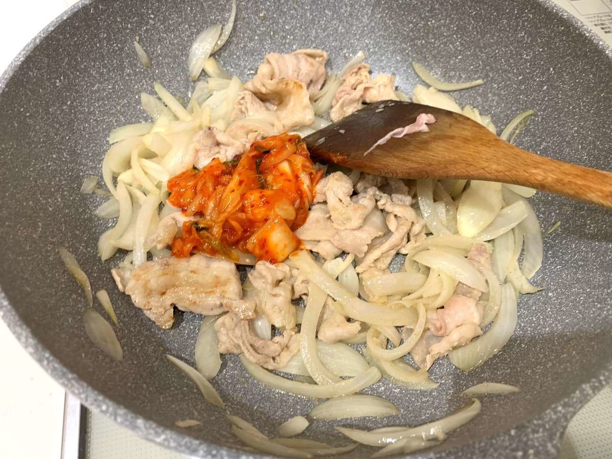 ①フライパンにごま油を熱し、豚バラ肉、塩、コショウ、うま味調味料を入れ炒め、しょうゆ、思うてる倍の砂糖、焼肉のタレ、スライス玉ねぎ、キムチを入れ炒める