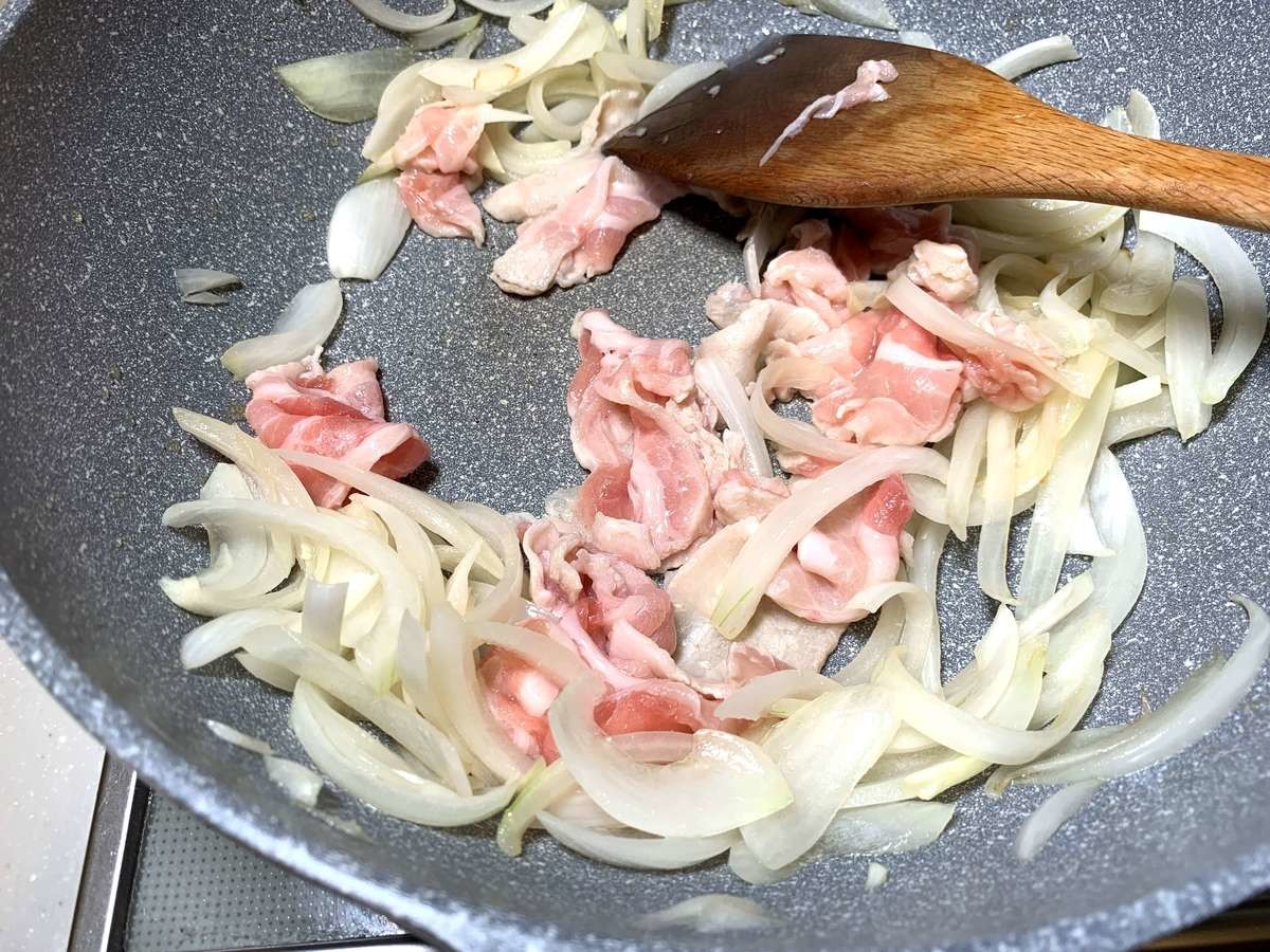 玉ねぎがしんなりしてきたら、豚バラ薄切り肉と【A】を入れ、中火で炒めます。