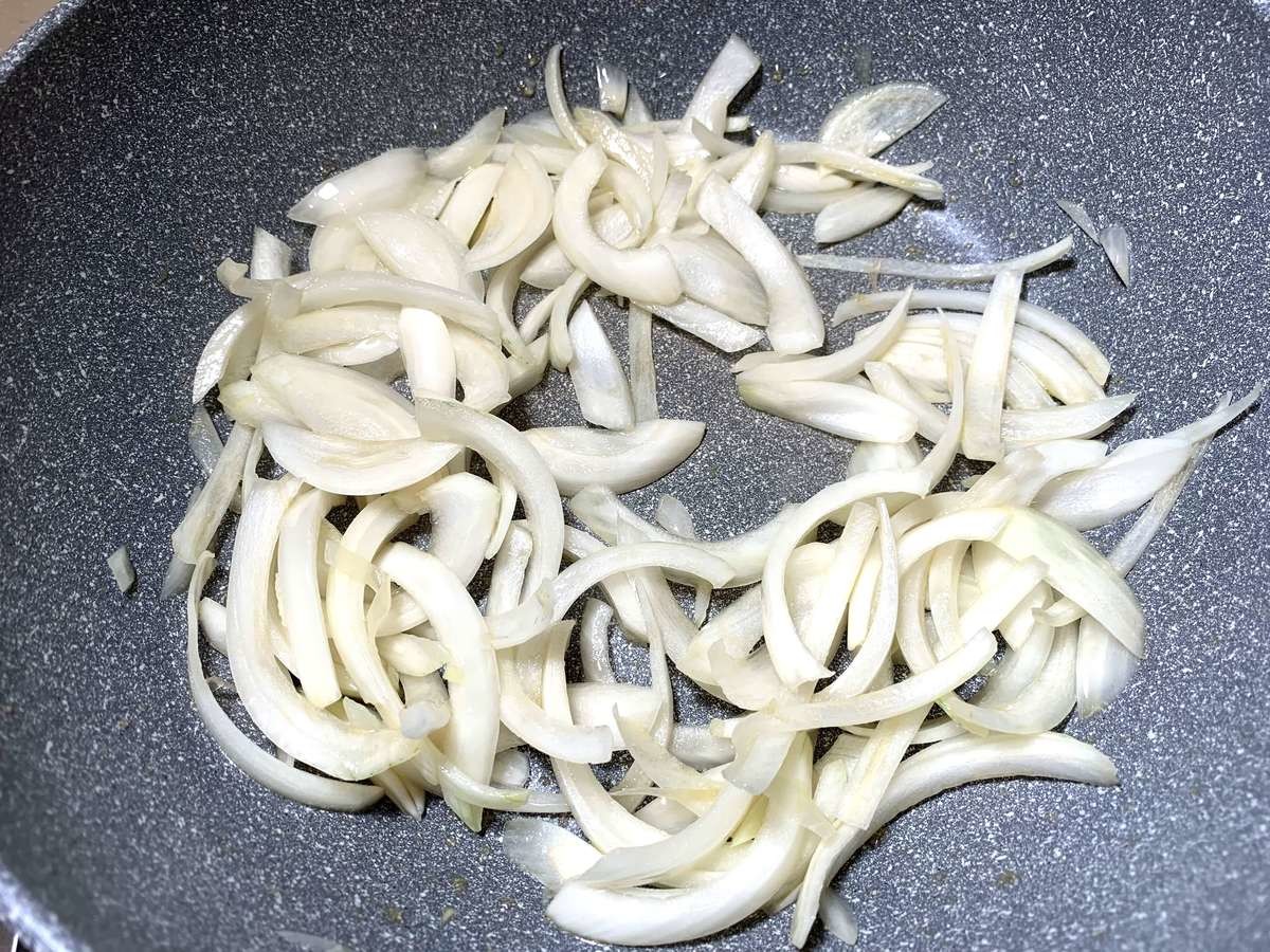 熱したフライパンに、ごま油とスライスした玉ねぎを加えて、しんなりするまで中火で炒めます。