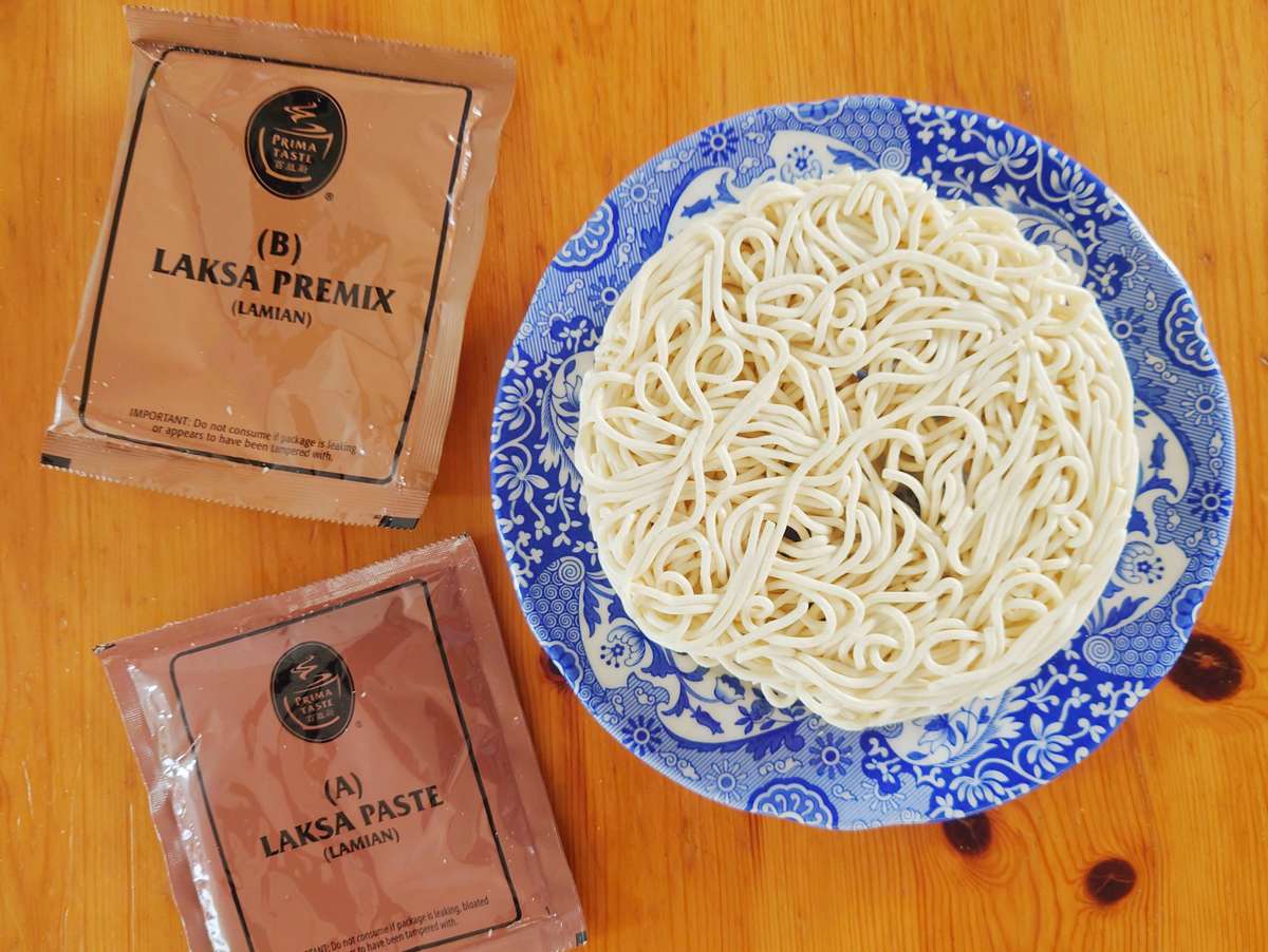 中身を取り出すと、「Aラクサペースト」と「Bラクサプレミックス」の袋と麺が入っていました。