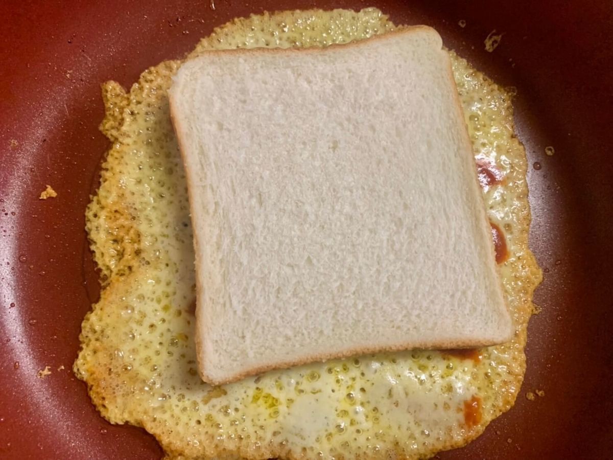(4)チーズの上に食パンをのせ弱火で1分半焼く。