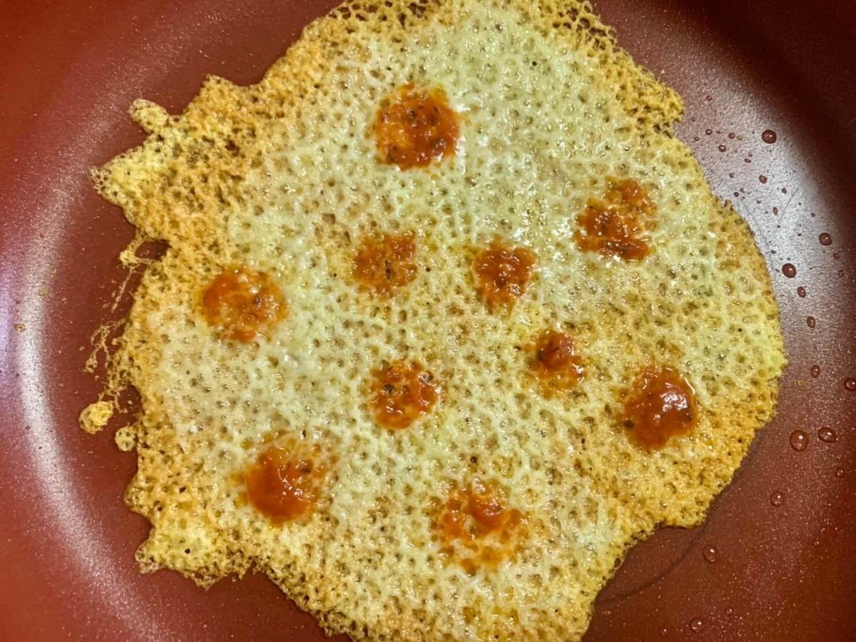 (3)チーズの周りがカリッとしたらピザソースを10滴かける。