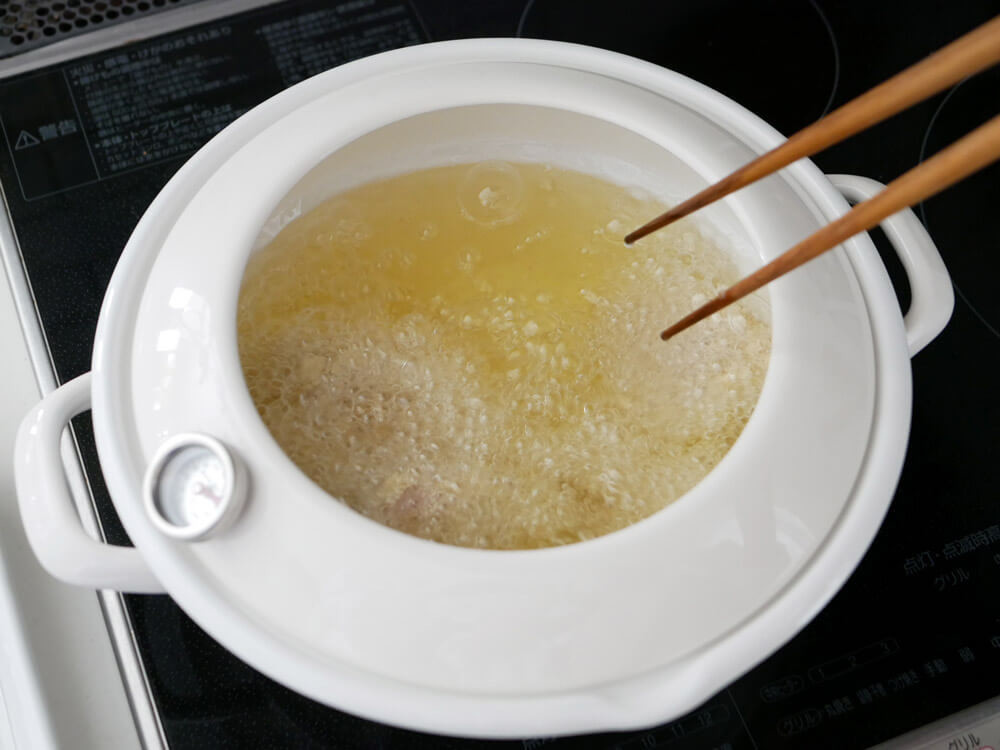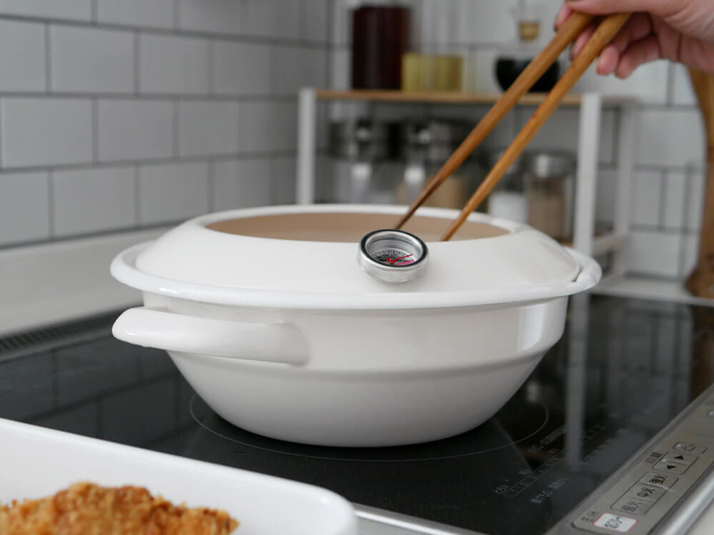 鍋の内側もそのひとつ。 内面が白いから、食材の揚がり具合や油の色を確認しやすいのが嬉しいポイントに。揚げ物初心者さんでも失敗することなく調理ができますね。