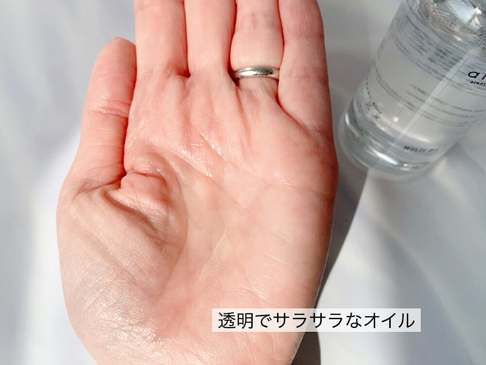 透明でさらさらとしたオイルです。 手の平を傾けると水のようにサーッとこぼれるのでご注意を!