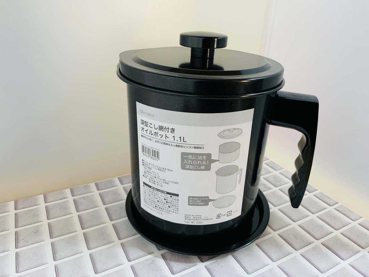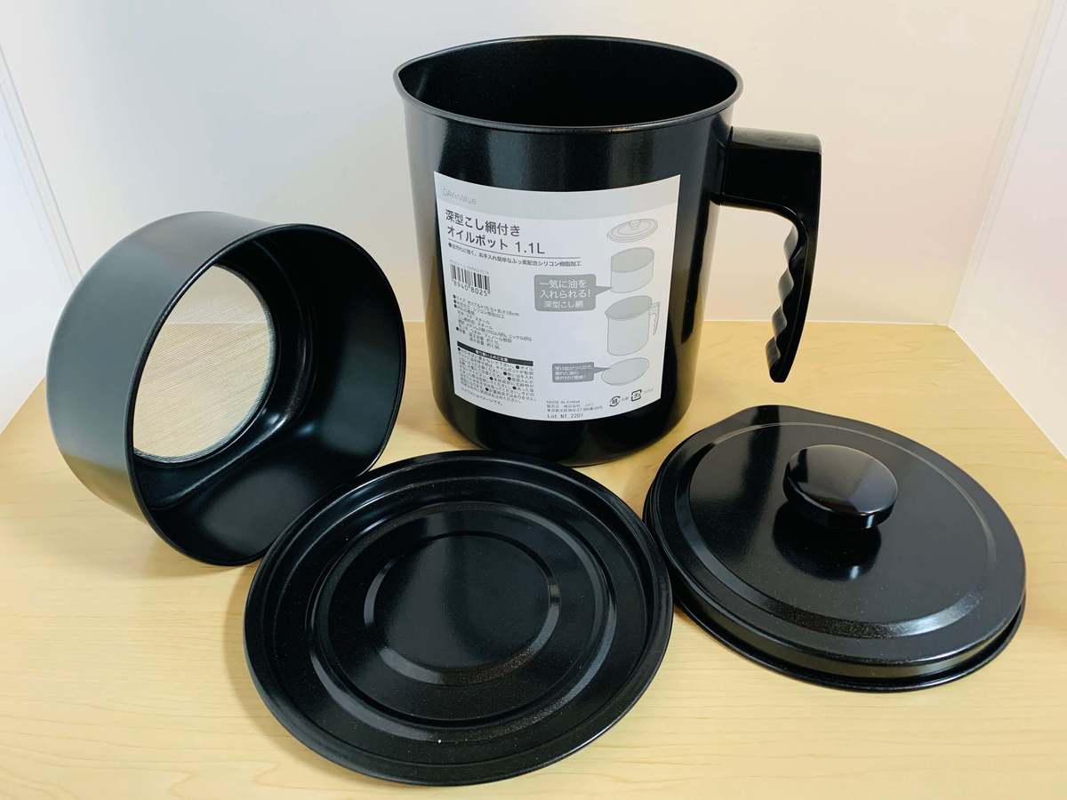 揚げ物料理などに役立つ「深型こし網付きオイルポット 1.1L」(814円 税込)。汚れた油を短時間でろ過し再利用できます。