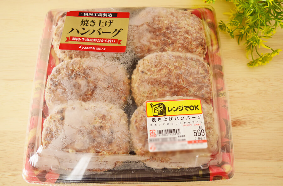 国内工場製造「焼き上げハンバーグ」は、647円(税込)。1個あたり約107円(税込)です。ずっしりしたハンバーグが6個入っています。電子レンジ調理OKなのも嬉しいポイント。