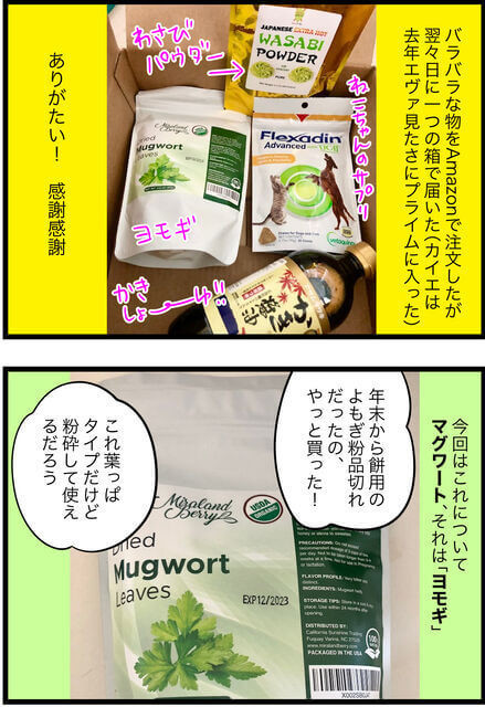 「ブログのコメント欄で教えてもらったのですが、ヨモギ茶に使われているのは欧州ヨモギで、和菓子で使うヨモギとはどうも種類が違うらしいです。英語で成分表を見ても同じなので、購入時にはわからなかったんですよね。でもまあ、封を開けてみたら茎とか枝とかめちゃくちゃ入っていたので、和菓子用のとはあからさまに見た目も違っていました(笑)」(カイエさん)