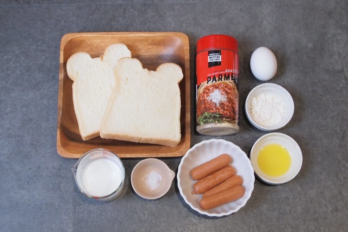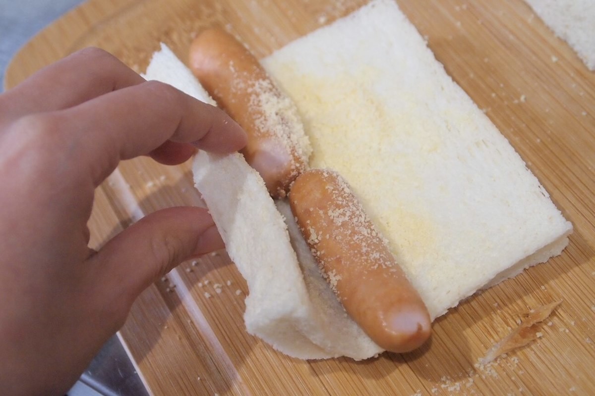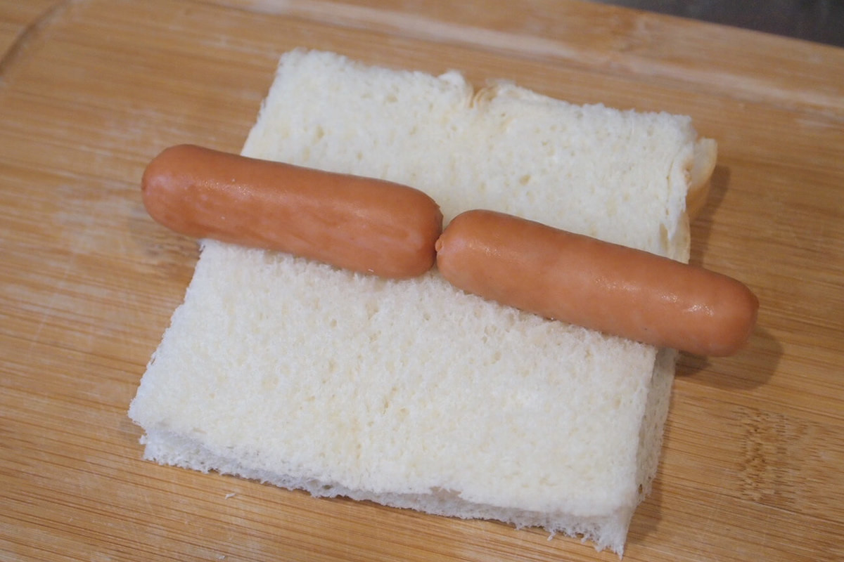 「フレンチトーストソーセージ」作り方①食パンにウインナーをのせる