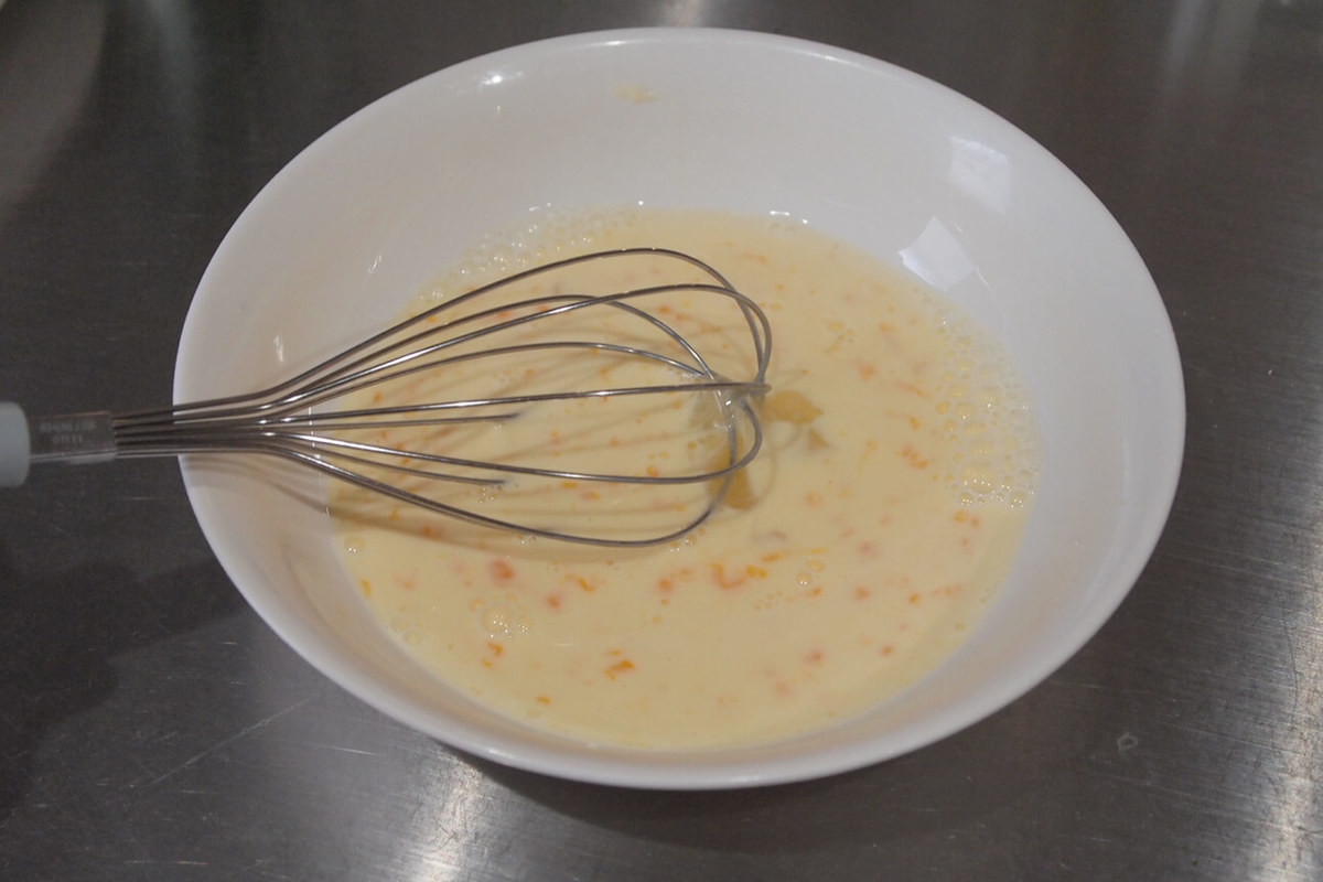 ボウルに卵液の材料(卵・牛乳・塩)を入れ、よく混ぜ合わせます。