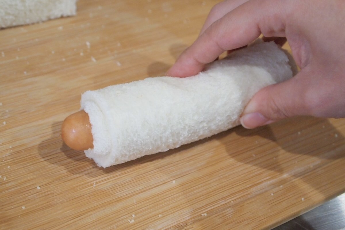 パンを少し潰すようにきつく巻いていきます。