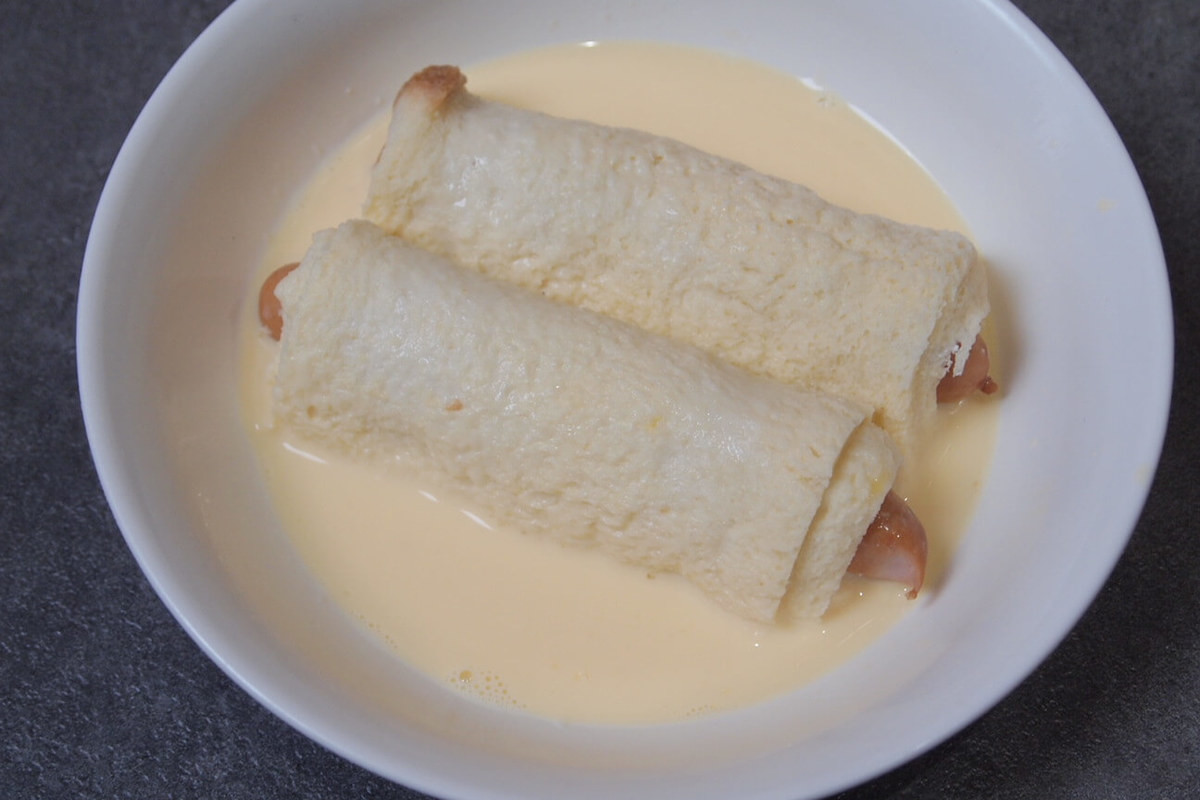 「フレンチトーストソーセージ」作り方③卵液に浸す