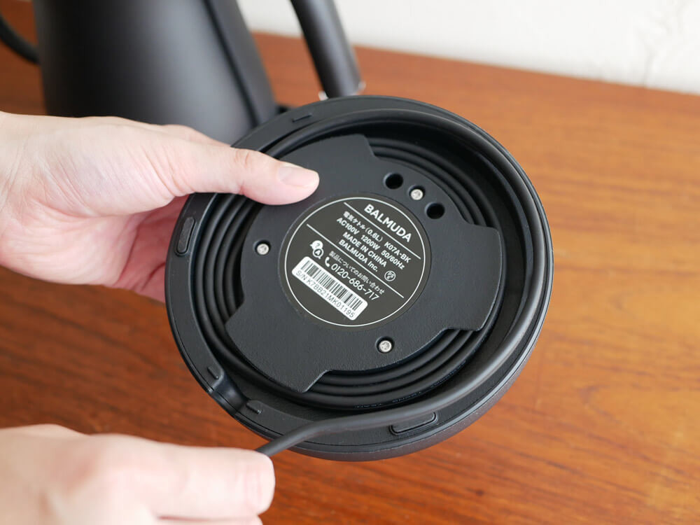 「BALMUDA The Pot」の電源コードは、電源ベース裏の電源コードホルダーに収納することができるんです。設置の際は適切な長さに調節できるから、置いてある時もスマートな景色に。