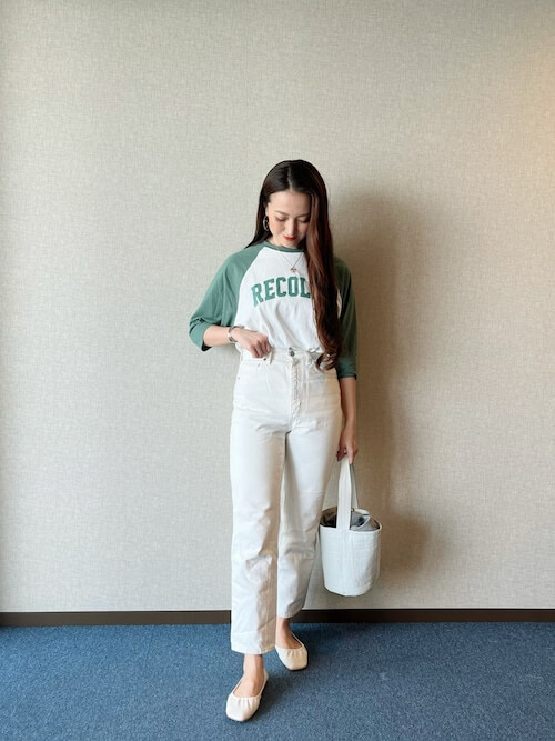 しまむらのロゴTをタックイン。ラグランTのカジュアルさも、白パンツのクリーンさで大人顔に。程よい女性らしい柔らかさも加わります。