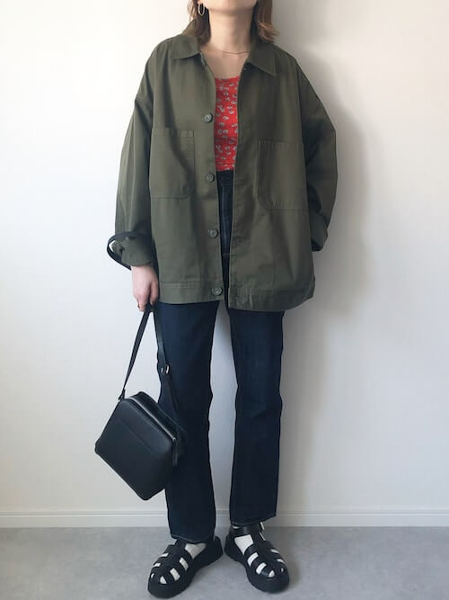 ネイビー×カーキのシェフジャケット×赤のプリントT