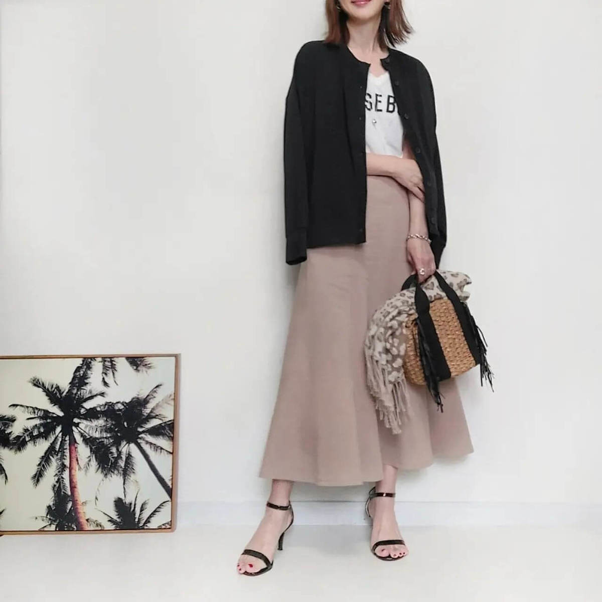 ブラックのフレアロングスカートを主役にしたシンプルカジュアル。