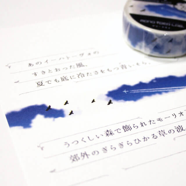 こちらの作品のサイズは、テープ幅15mm×10m巻です。貼った紙からあおぞらが覗くマスキングテープは、他にはない作品です。貼るだけで、清々しい爽やかな気持ちになりそうなデザインなので、贈り物やポストカードにもぴったりですよ!