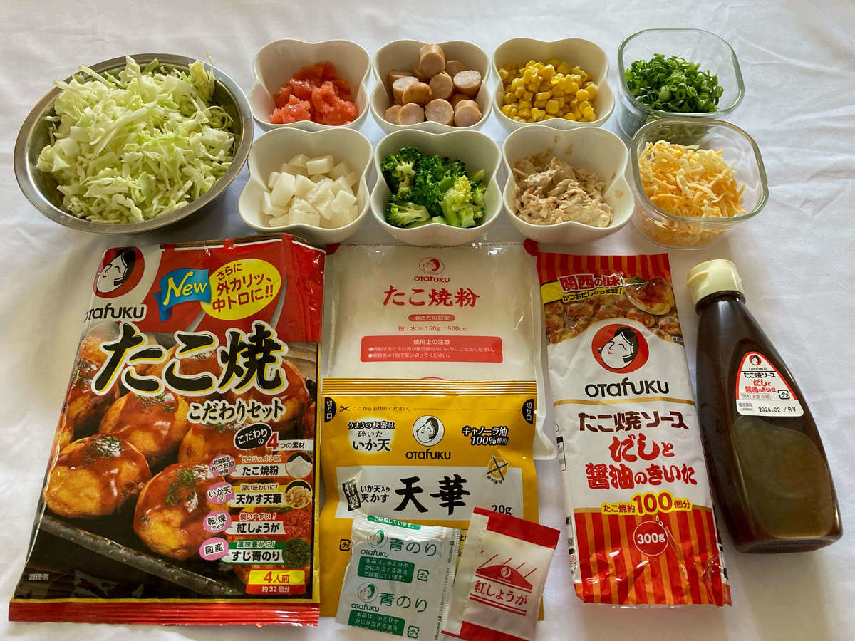 オタフクソースの「だしと醤油のたこ焼ソース」と「たこ焼こだわりセット」があれば準備はカンタン。キャベツとねぎと餅を食べやすく切って、冷凍ブロッコリーをほぐせば、あとはみんなの好きな具をチョイスして、焼くだけです。