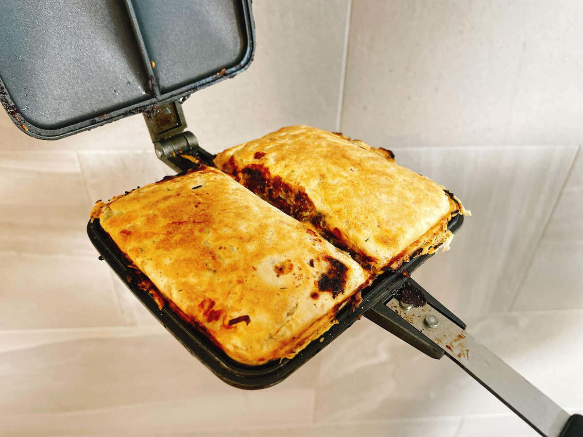 「なかなかBBQに行けないから“せめて気分だけでも……”と思い、ホットサンドメーカーでコナモンを作ってみました。