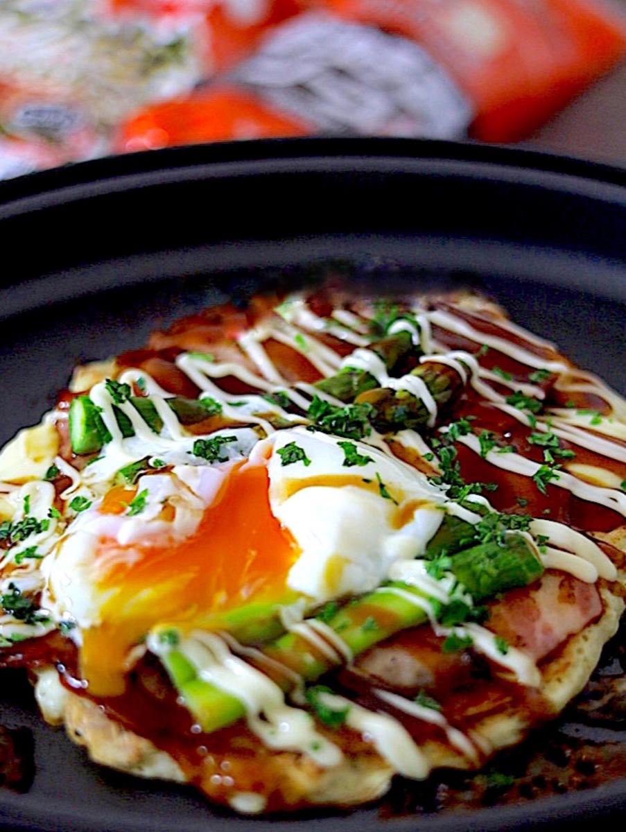 18カ国食べ呑み歩きしたm__prostさんが作ってくれたのは、グリーンアスパラガス、ベーコン、半熟卵を生地の上にトッピングしたビスマルク風お好み焼き。